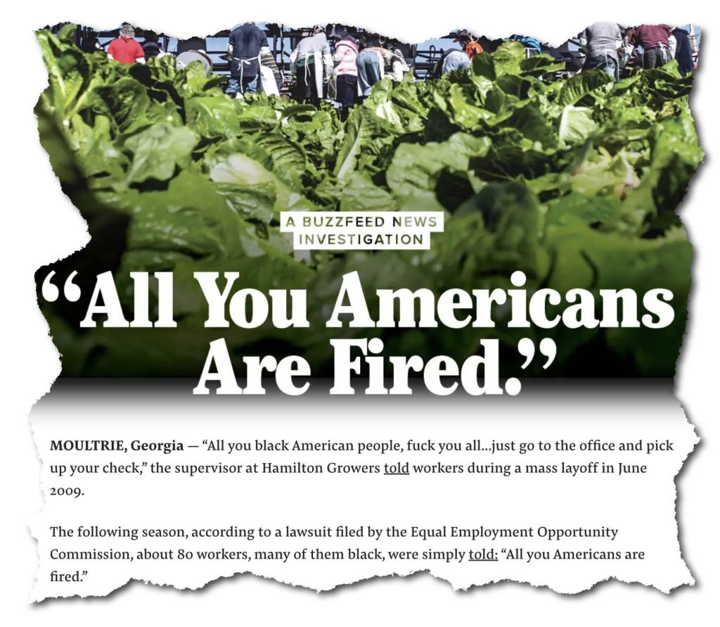 Just last year, Black farm workers reached a settlement with Mississippi growers for replacing them with white guest workers from South Africa.