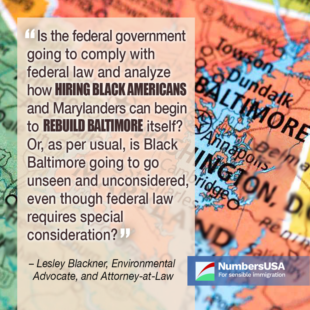 “a comprehensive environmental impact statement of the proposed labor sourcing plan and, procuring an economic analysis on a plan to source labor and apprenticeship opportunities from the local and national descendant of U.S. slaves community that reflects the percentage of Black people in Baltimore, currently 62%, according to Census.gov.”