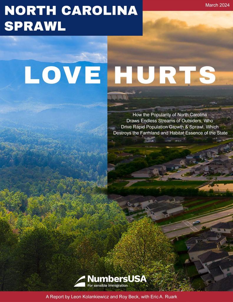 “Love Hurts,” a NumbersUSA report about the loss of rural land and habitat in North Carolina is live on www.NCSprawl.com. This is the 17th collaboration between Roy Beck and Leon Kolankiewicz, and NCSprawl.com is the 7th “micro website” we’ve created to democratize our findings, including the following: