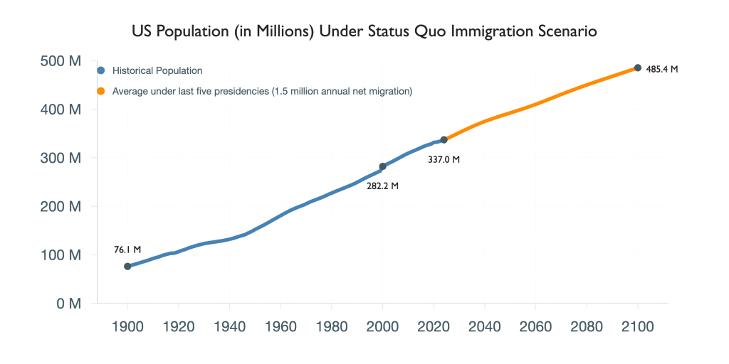 Recent Immigration Surge Has Been Largest in U.S. History, boomed an article in the New York Times last year. Net immigration levels under the Biden administration averaged nearly two and a half million annually. This drove the highest U.S. population growth in decades, according to the Census Bureau, putting us on pace to nearly double America’s population by the end of the century.