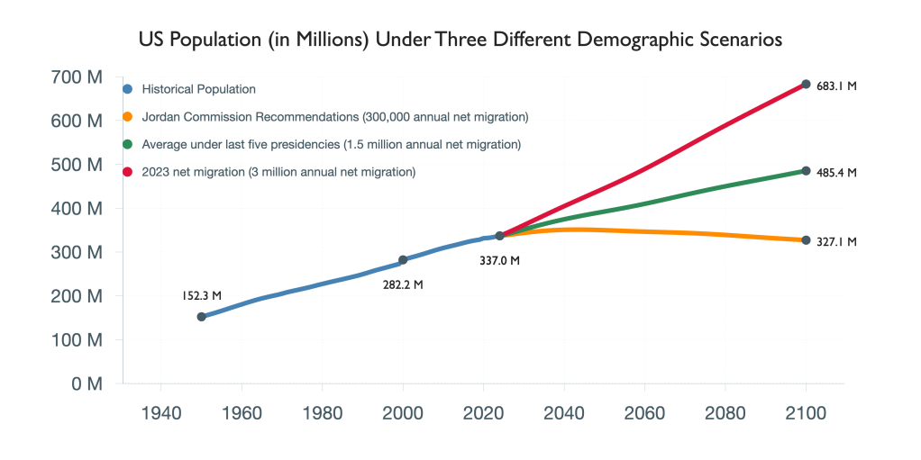 As you can see, implementing the Jordan Commission’s immigration levels would lead to a 3% decline in population over the next seventy-five years, from 337 million to 327 million — essentially stabilizing the U.S. population. Locking in the highest immigration levels reached during the Biden administration, in contrast, would more than double the U.S. population, which would reach 683 million in 2100 with no end to growth in sight.