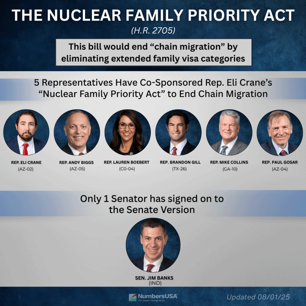 In the House, only 5 representatives have signed on to Rep. Eli Crane’s Nuclear Family Priority Act (H.R. 2705):