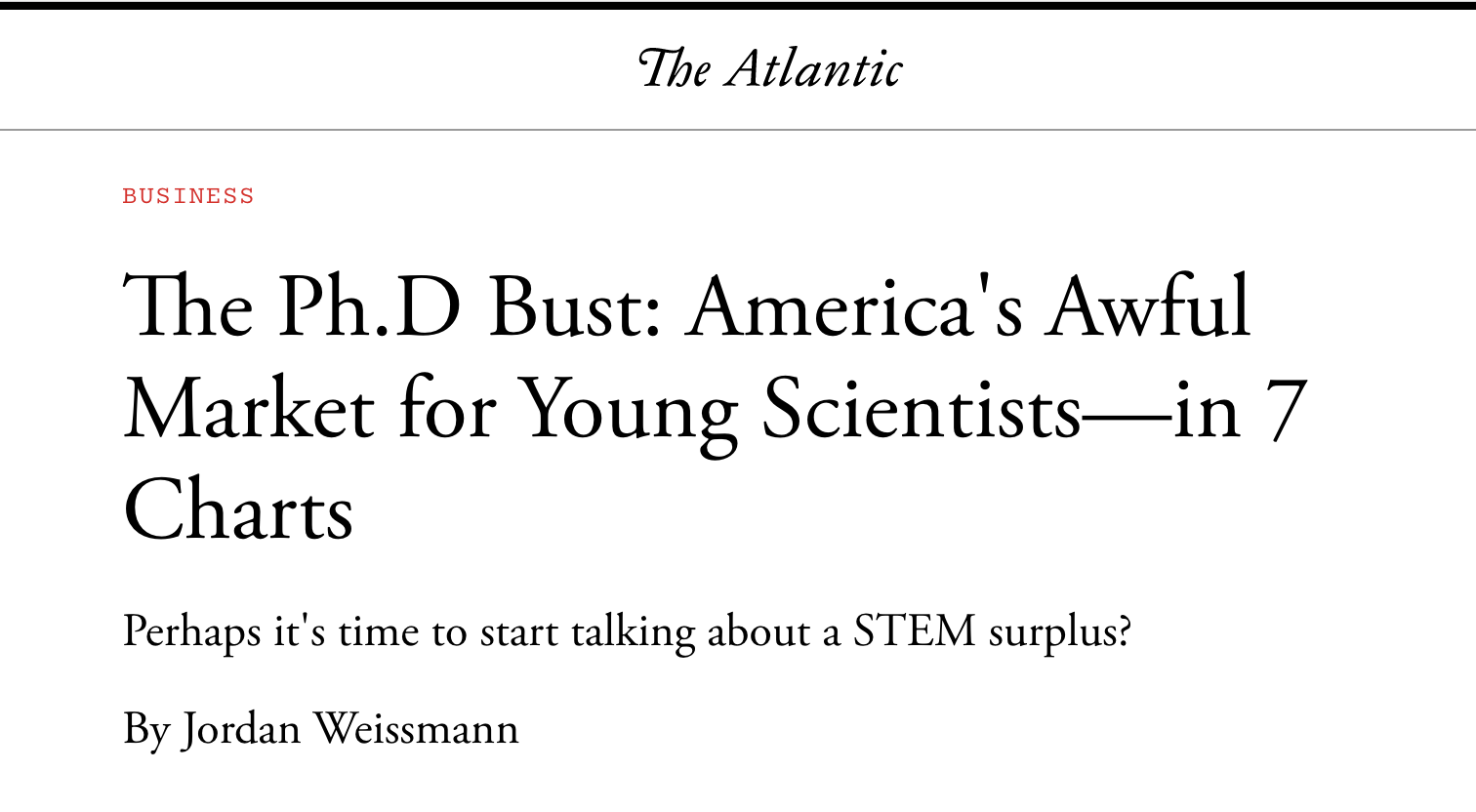 “…following a bachelor’s degree and another four or five years of intensive study and low-wage labor in a professor’s lab, the typical STEM Ph.D. can look forward to yet another six or eight years working at an average salary of $50,000 before they can compete for a regular job in a flooded labor market. For some, a deep and abiding love of science and engineering and willingness to play the job lottery keeps them in the game. For many others, these dim prospects push them to go elsewhere. And this pyramid scheme—of many low-paid graduate students and post-docs working for a small number of senior scientists—rests on having the large supply of foreign students…”