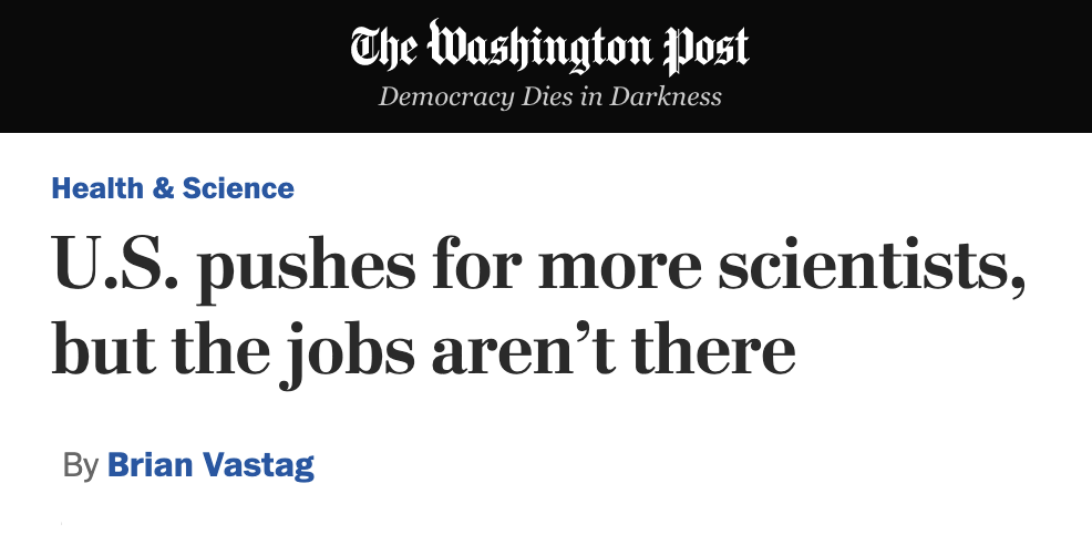 By the 2000s, colleges and universities were graduating more than twice the number of STEM graduates (Bachelor’s, Master’s, and Ph.D.’s) than there were expected jobs. That didn’t stop one administration and Congress after another from toying with the ideas that are now found in The COMPETES Act. These headlines are from 2012-2013, but they could have been written today: