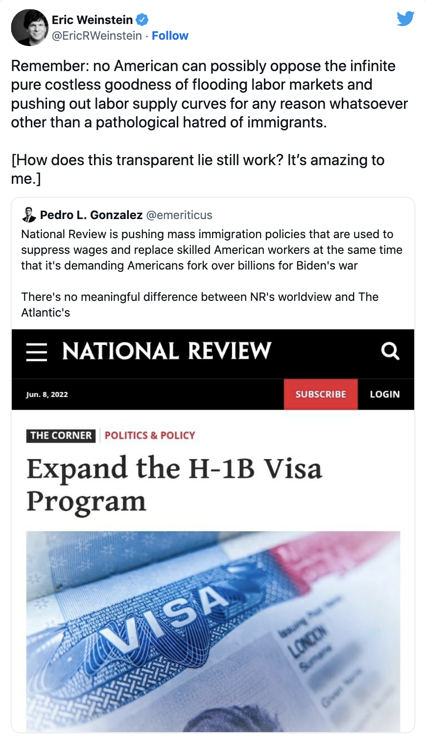 Expanding immigration, the actual theory here is, let’s find ways to suppress wages as a way of getting like, that’s the actual mechanism. And it doesn’t sound like such – the idea sounds less savvy if your idea is ‘hey let’s find ways to suppress wages to get out of this’. Especially when you then have to admit that one of the consequences of immigration is suppressing wages.”