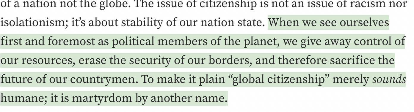 “After all,” writes Pamela Denise Long in an article for Medium, “political power and representation are anchored in the boundaries of a nation not the globe. The issue of citizenship is not an issue of racism nor isolationism; it’s about stability of our nation state.”
