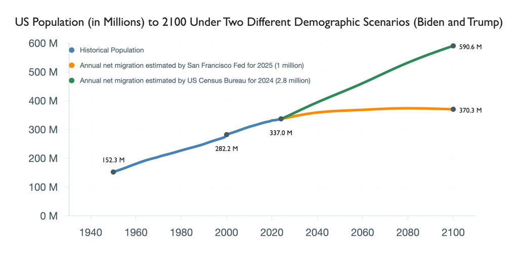 The difference between projecting out 1 million and 2.8 million annual net migration is immense: a population in 2100 of 370 million versus one of 591 million! It is also the difference between a population that has leveled out and stopped growing, and one that continues to gallop upward relentlessly.