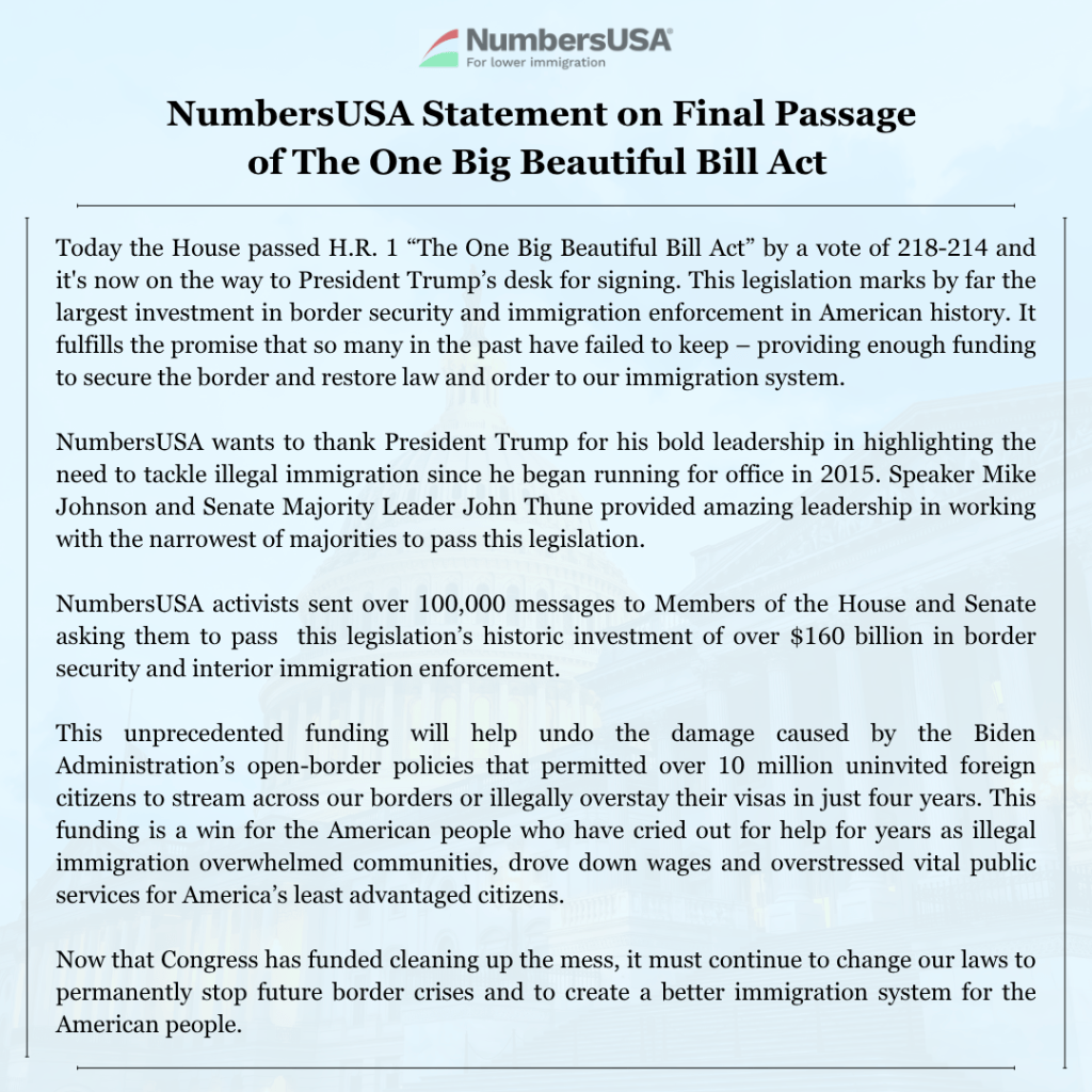 NumbersUSA wants to thank President Trump for his bold leadership in highlighting the need to tackle illegal immigration since he began running for office in 2015. Speaker Mike Johnson and Senate Majority Leader John Thune provided amazing leadership in working with the narrowest of majorities to pass this legislation.