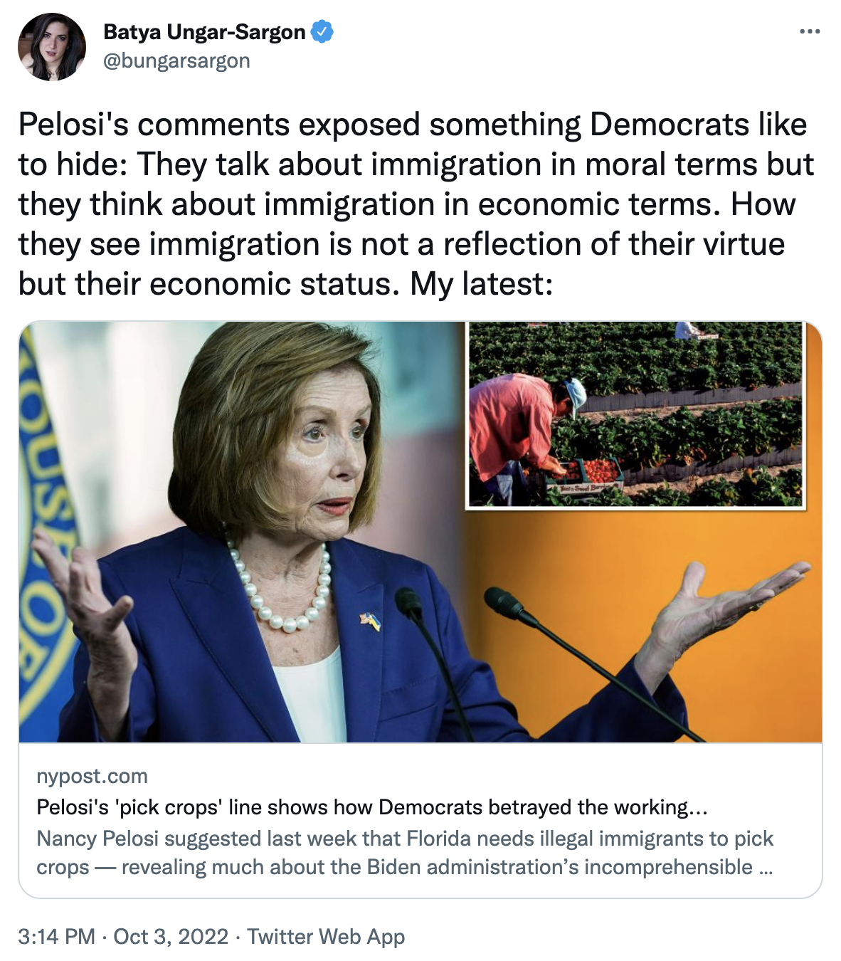 [H]er comments exposed something the Left has been struggling mightily to hide: that they talk about immigration in moral terms when in actual fact, they think about immigration in economic terms.