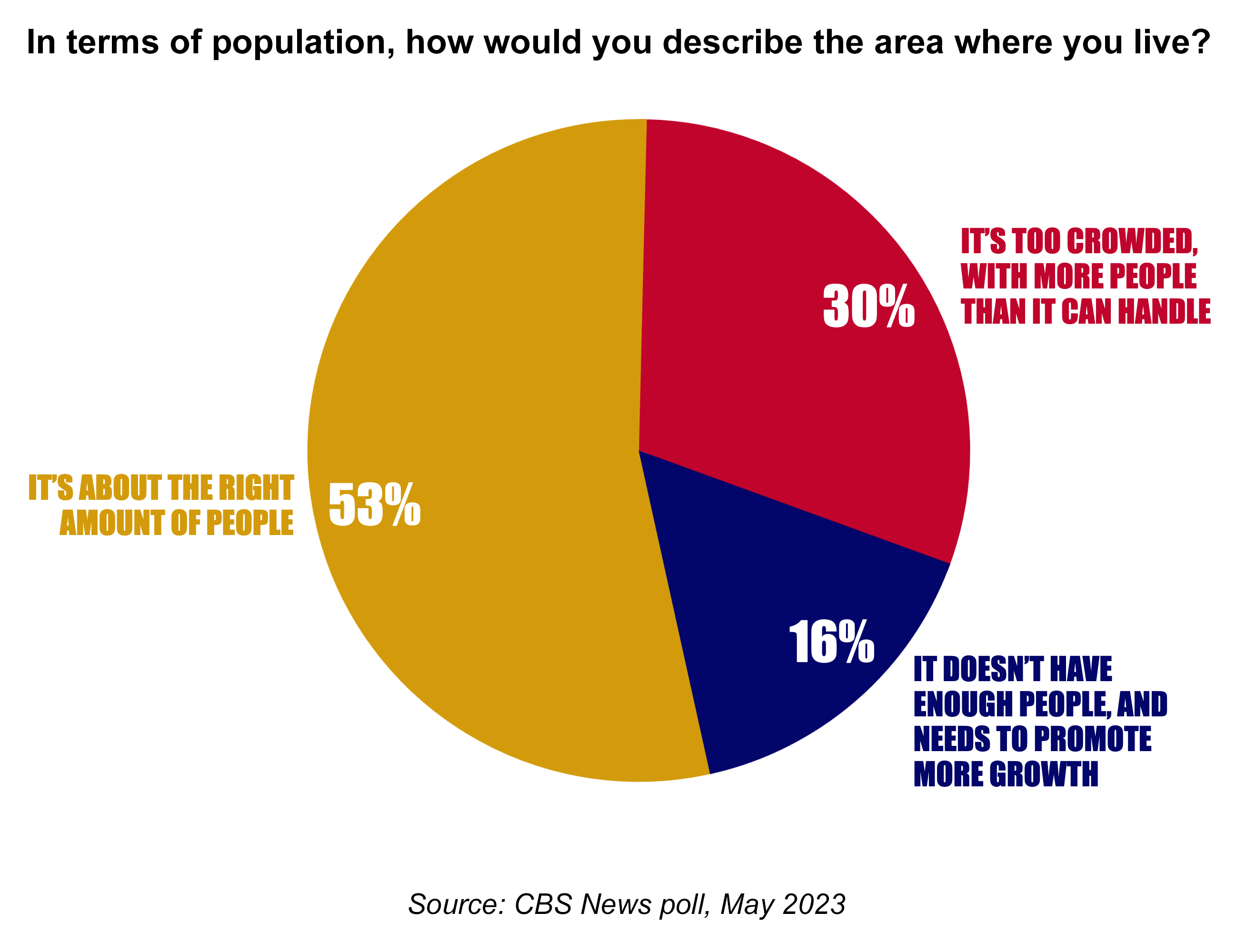 In a recent CBS News poll (May 2023), Americans were asked about population density where they live, and whether or not their areas needed more people. Almost a third of Americans said the area where they live is “too crowded, with more people than it can handle,” while a majority said “It’s about the right amount.”