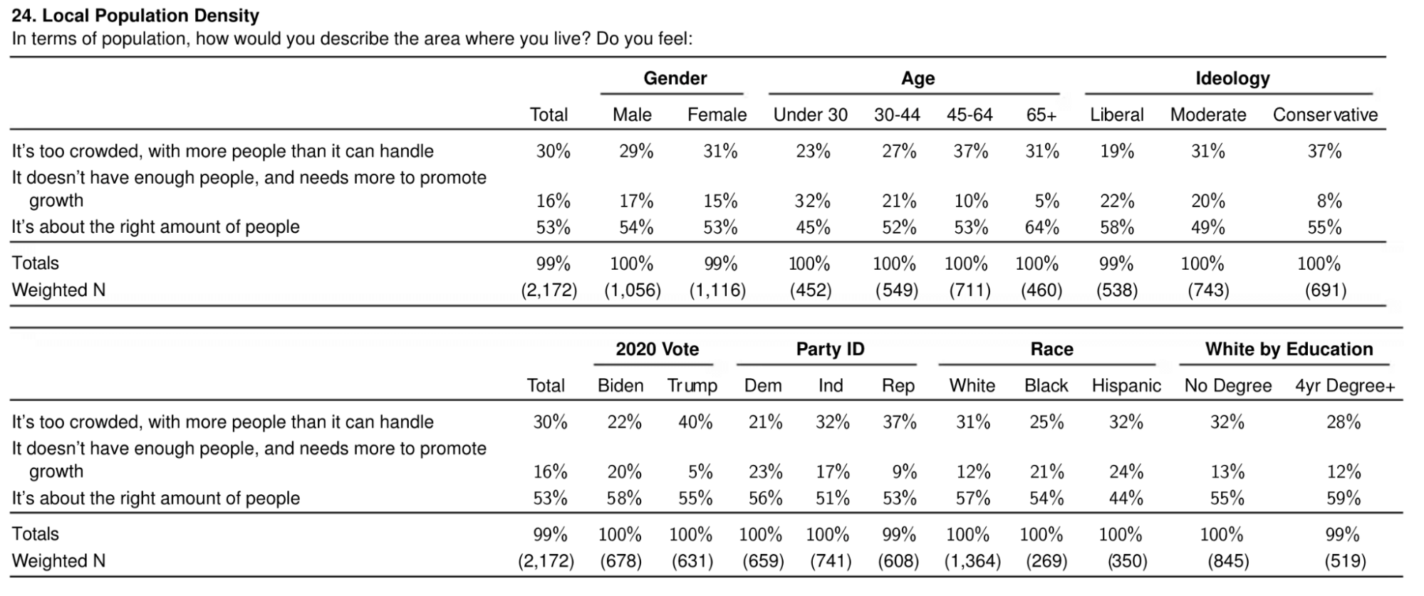 Four out of five Americans say the area where they live either has enough people living there, or is already too crowded.