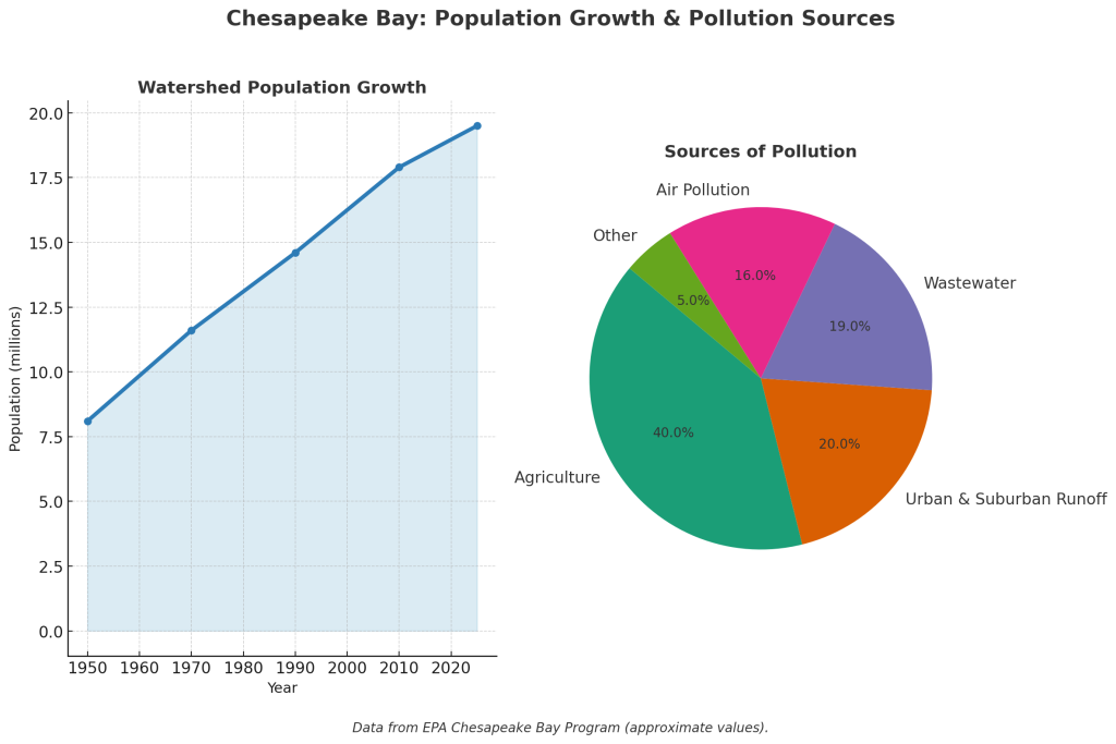 All this, combined with increased point discharges from sewage treatment plants and factories, has led to dire consequences for the bay. Excessive nutrients like nitrogen and phosphorus flow into the Bay, promoting algal blooms that deplete oxygen, harm underwater life, and create “dead zones.”