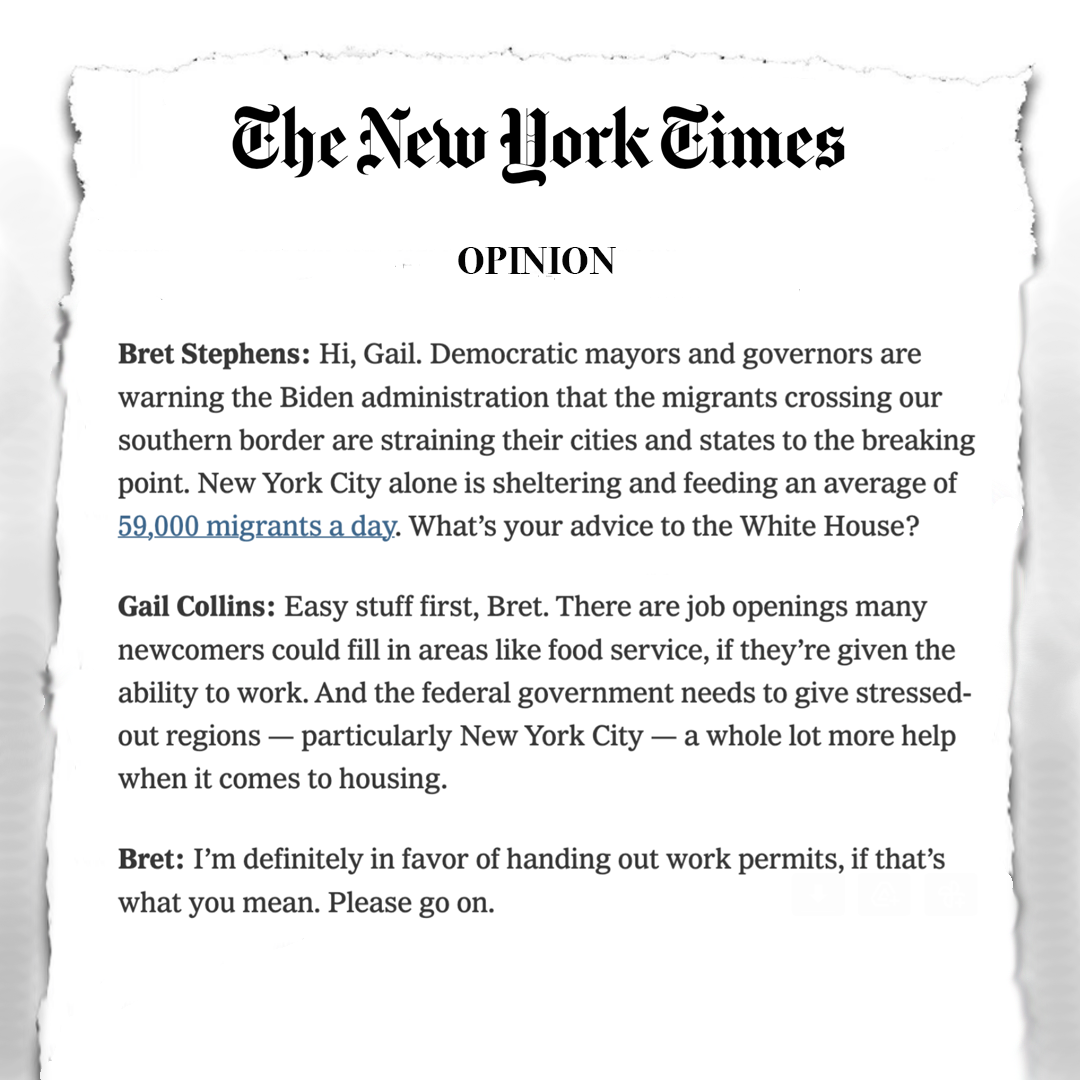 Stephens & Collins come right out of the gate ready to dispose of an obvious consensus item: work permits for all the migrants! This is something Mayor Adams has asked for. It’s something Governor Hochul has asked for. And it’s clearly in tune with the Biden Administration’s goal of (illegally) increasing permits for foreign workers.