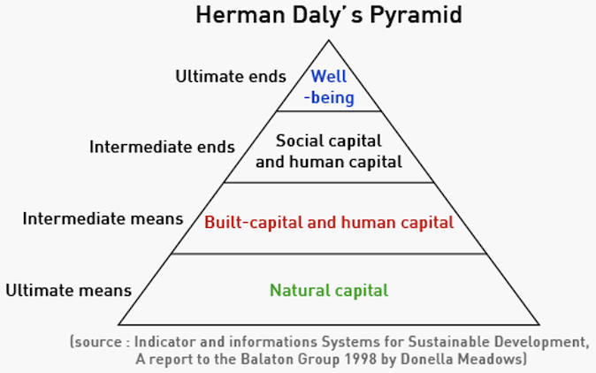 Herman also designed his “ultimate means to ultimate ends” pyramid, which graphically illustrates the roles of natural capital and economic growth in contributing to human wellbeing.