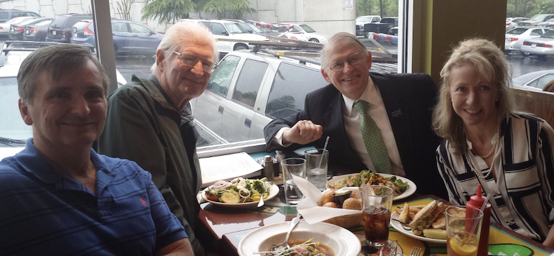 The author (l.) enjoying lunch in 2014 at a diner in Hyattsville, Maryland with Herman Daly and Roy Beck and Anne Manetas of NumbersUSA