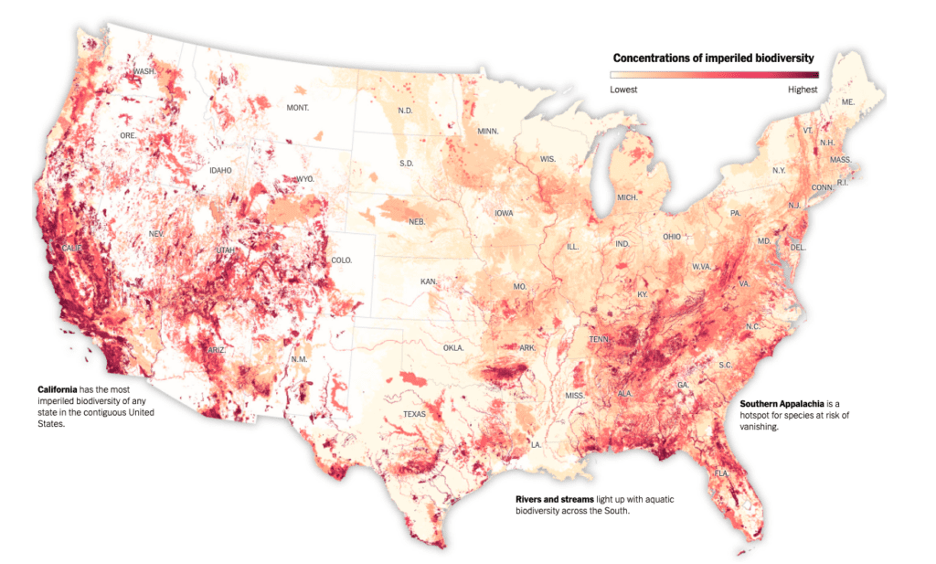 A year prior (2022), the E.O. Wilson Biodiversity Foundation published a report titled “This Map Shows Where Biodiversity Is Most at Risk in America,” which delineated the “concentrations of imperiled biodiversity” – places most likely to have plants and animals at high risk of global extinction.