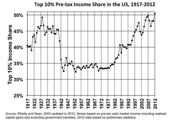 Deaton asks us to compare two graphs. The first is a rather famous graph from Emmanuel Saez and Thomas Piketty that charts inequality in the United States.