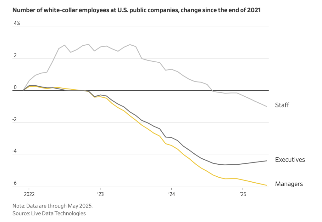 “Added up, tens of thousands of newly laid off white-collar workers in America are entering a stagnant job market with seemingly no place for them,” reports Lindsay Ellis in the Wall Street Journal.