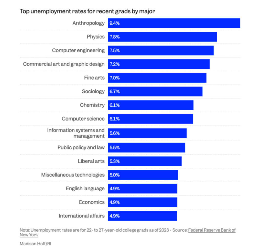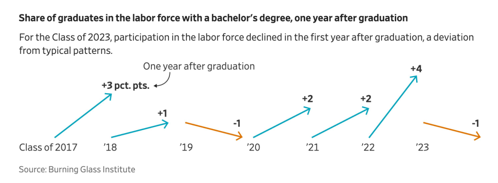 “With each new class after 2020, an ever-smaller share of graduates is landing jobs that require a bachelor’s degree, according to a Burning Glass Institute analysis of labor data. That’s happening across majors, from visual arts to engineering and mathematics. And unemployment among recent college graduates is now rising faster than for young adults with just high-school or associate degrees.