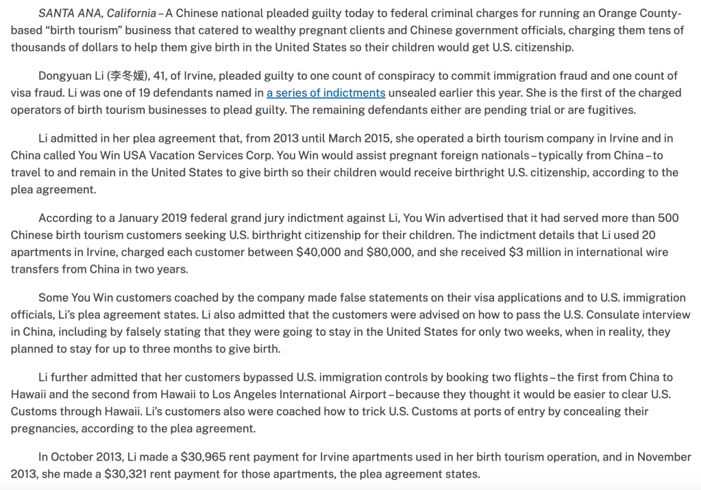 As part of her plea agreement, Li will have to forfeit “several Mercedes-Benz vehicles,” but the clients she coached to lie to the U.S. government will keep the citizenship status of their children, in accordance with U.S. policy.