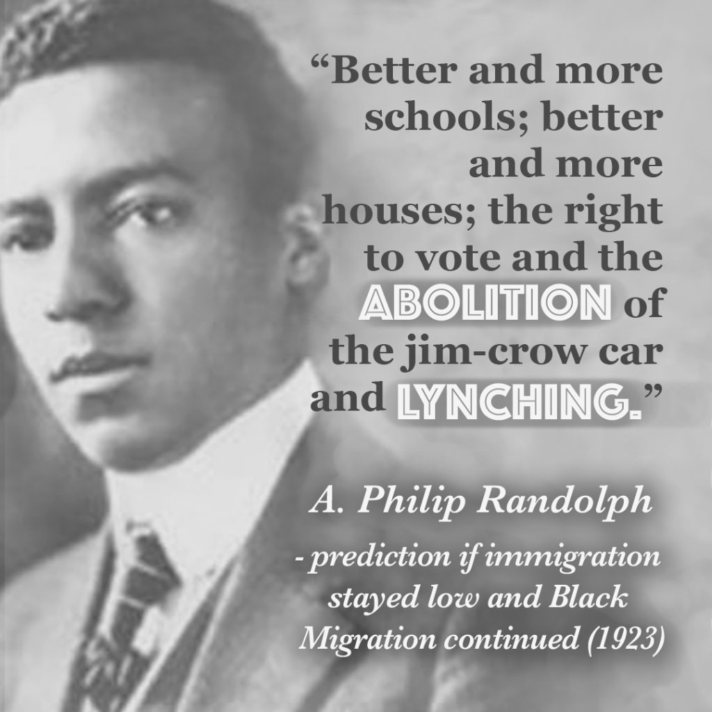 Mass immigration resumed after the war, but Black leaders like A. Philip Randolph successfully lobbied to permanently lower immigration to more moderate levels. President Coolidge signed the Immigration Act of 1924 into law and the Great Migration took off. When the Great Migration began, 90 percent of Black Americans were living in the South. By the 1970s, nearly half were in the North and West.