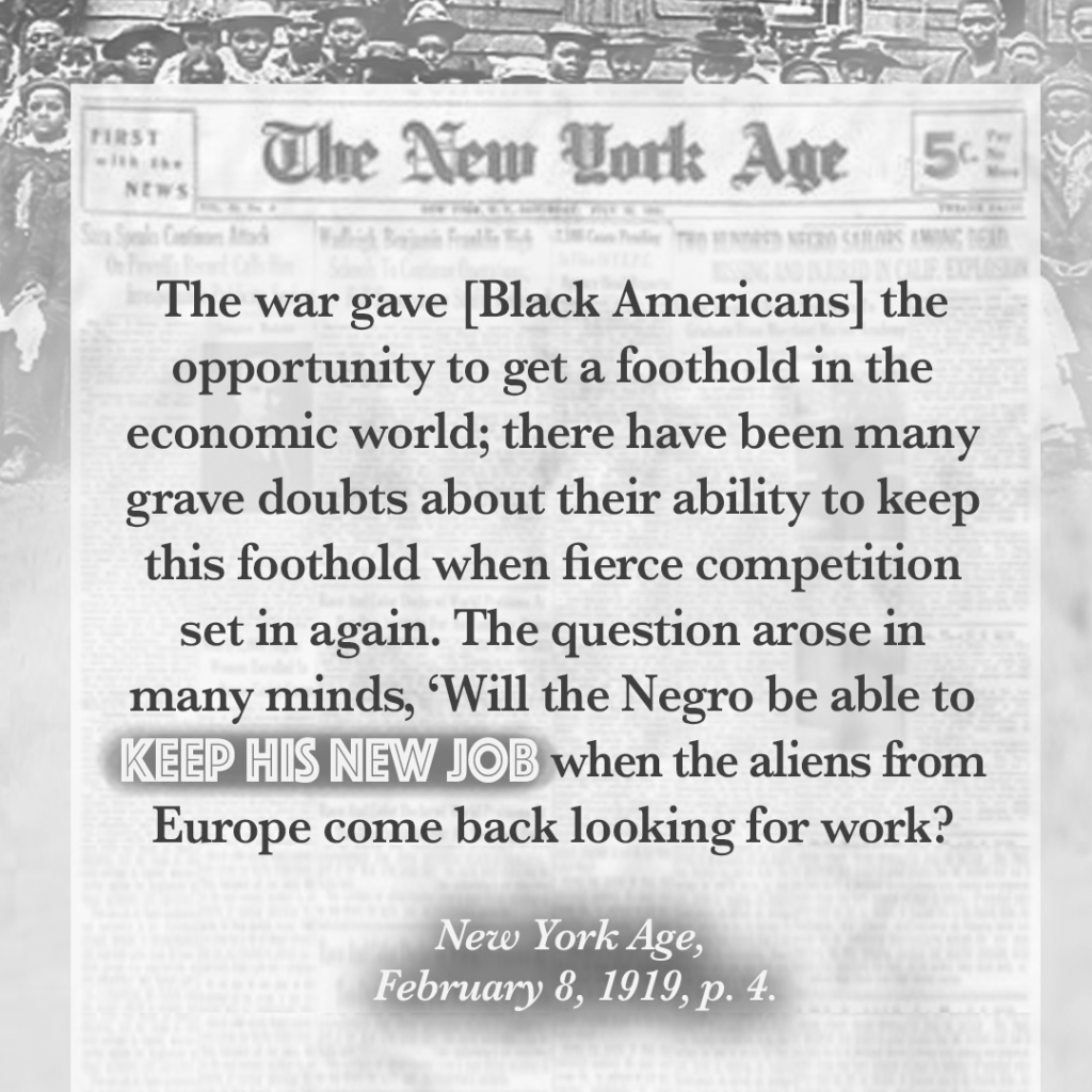The Great Wave of immigration between 1880-1924 reduced the economic opportunities for Black Americans in the North. As they had before the war, immigrant unions viewed free Blacks and emancipated slaves as labor competition. Unions expelled their own white members if they were caught working on a job site with Black workers. Frederick Douglass’ own son, Lewis, who had served in the famed 54th Massachusetts Infantry Regiment, was barred from union membership and then protested as a scab for taking a non-union job.