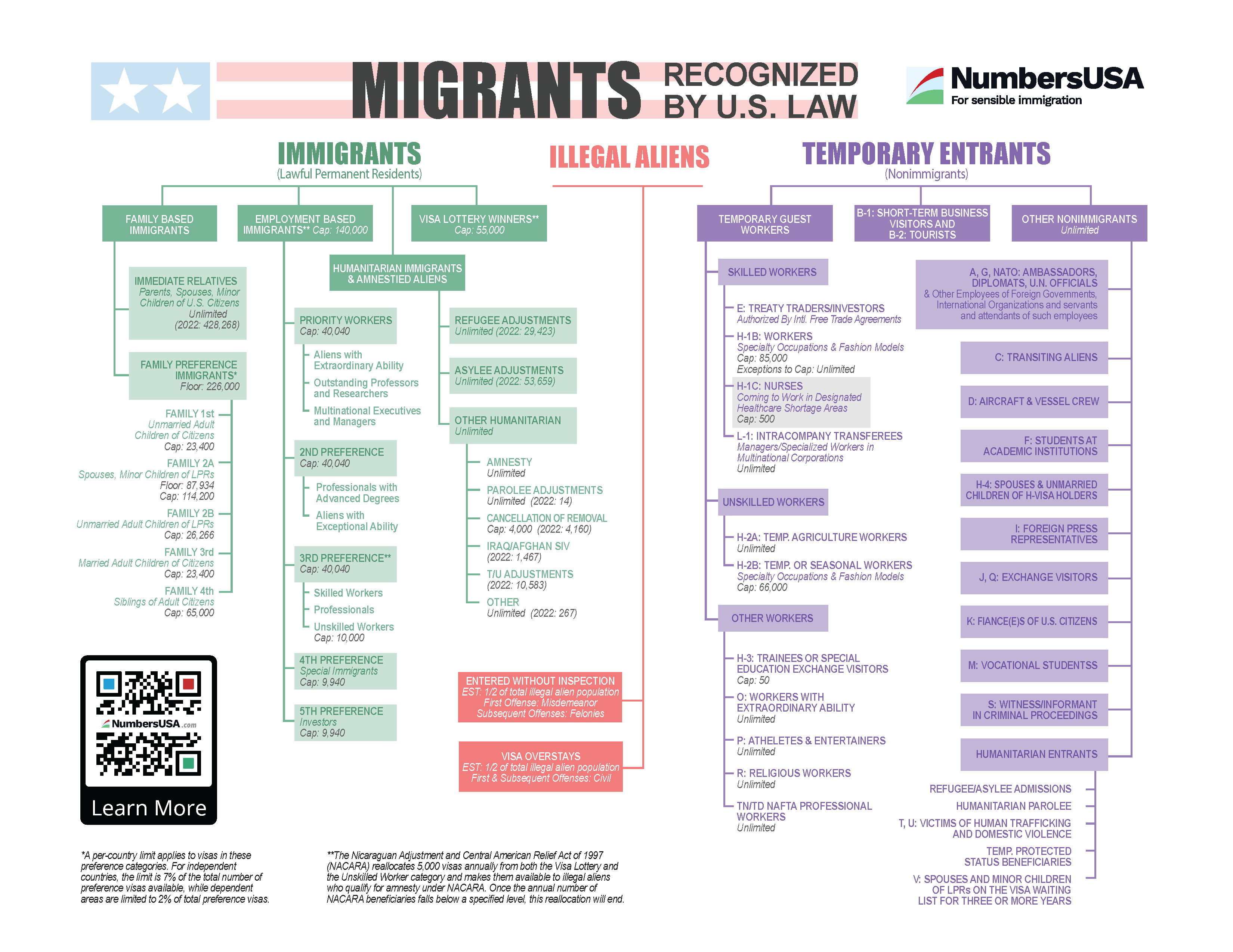 There are three categories of migrants and immigration recognized under U.S. law: permanent legal immigrants, temporary entrants, and illegal aliens. See the State Department Directory of Visa Categories. In recent years, Congressionally-mandated legal immigration has held relatively steady, while illegal and irregular immigration has skyrocketed.
