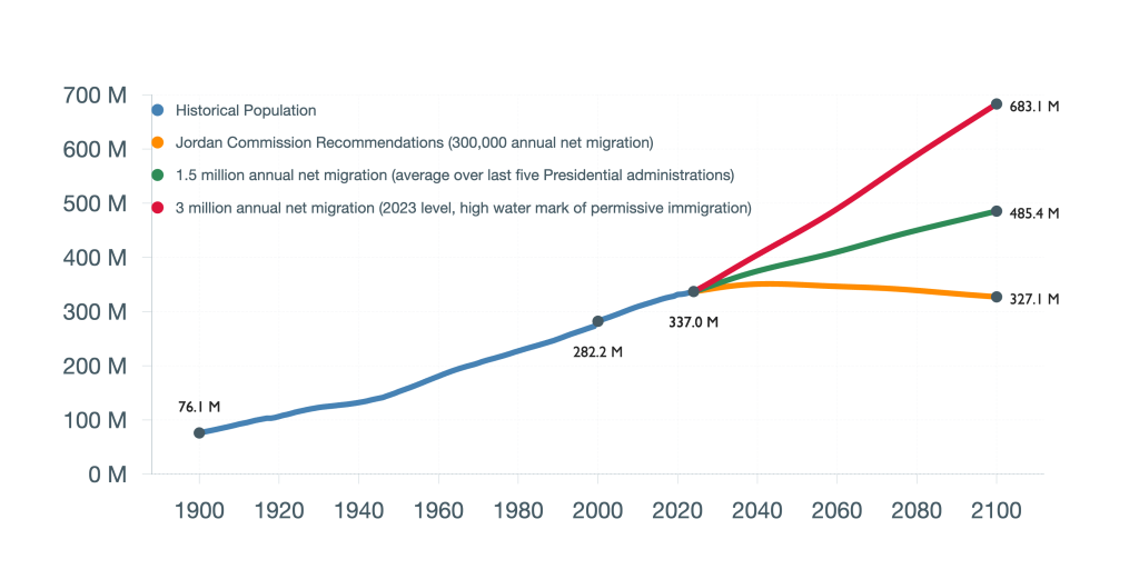 Recent net immigration levels have averaged nearly two and a half million annually. That puts the U.S. on pace to nearly double our population by the end of this century, as shown in the population projection below.
